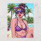Um cartaz que você pode enquadrar ou mandar para uma amiga com uma senhora de pop-arte bonito em um biquíni de bolinhas roxo, óculos de sol e bandana na praia em um estilo de revista em quadrinhos tropical. Diga oi para um amigo ou guarde-o para você mesmo para o trabalho de arte fofo!