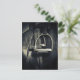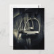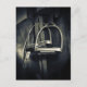 Um cartão postal com uma fotografia branca e preta. Uma foto de uma sela de couro inglesa focada nos estribos de prata. Perfeito para entusiastas de equitação em inglês.