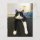Uma fotografia hilariante de um gato preto e branco com pernas dianteiras penduradas sobre o lado do sofá para que tudo o que vocês veem são as duas pernas e cabeça.