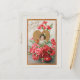 Cartão de saudação de Dia de os namorados vintage doce e romântico, com crianças sorrindo de cabelo escuro, coração de ouro, roteiro de "Saudações ao Namorados" e buquê de cravos vermelhos e cor-de-rosa. A parte traseira apresenta campos de texto florais e editáveis complementares.