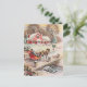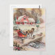 Cartão de Natal antigo com pessoas andando de carruagem vermelha puxada por cavalo. Eles estão atravessando uma ponte de pedra em direção a uma casa vermelha encantadora. Belo cartão antigo com caixa de correio verde e árvores cobertas de neve.