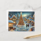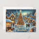 O cartão-postal apresenta uma cena de inverno acolhedora numa pequena aldeia. A neve coberta o chão e os telhados de casas charmosas e antiquadas adoradas com luzes de Natal cintilantes. No centro, uma grande árvore de Natal fica decorada com ornamentos coloridos e uma estrela brilhante no topo. Pessoas em roupas quentes de inverno são patinagem no gelo em um lago congelado, enquanto outras são coletadas ao redor de uma barraca de madeira servindo cacau quente. O céu é um azul escuro profundo com flocos de neve suaves caindo, somando-se à atmosfera festiva. No primeiro plano, "Feliz Natal" é escrito em um roteiro elegante e ouro com um brilho sutil, adicionando calor à cena fria. Este design encapsula o calor, a alegria e o espírito comunitário do Natal num cenário de inverno pitoresco.