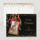 Que chic, mas cartão de Natal divertido. A foto está em uma etiqueta de presente com fita de ouro encaracolada. O brilho acentua e completa o cartão postal para um visual festivo de férias. Fundo preto com cartão postal de Natal "Feliz Natal" para toda a sua família e amigos.