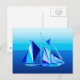 Cartão postal moderno do século médio - pintura digital geométrica de um veleiro / iate em tons de azul-oceano, do aqua leve ao cobalto profundo