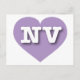 Este cartão-postal apresenta um coração de lavanda em forma e legal contendo as letras maiúsculas, brancas e em negrito NV, a abreviação oficial de Nevada, o estado prateado. O reverso do cartão postal é vazio, aguardando seu texto personalizado ou sentimentos escritos à mão.