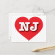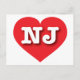Este cartão-postal apresenta um coração vermelho vibrante contendo as letras maiúsculas, brancas e em negrito NJ, a abreviação oficial para o estado de Nova Jersey, o estado do jardim.