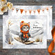 Um cartão postal de aniversário com uma aquarela engraçada apresentando um gatinho em uma prancha de neve em uma terra maravilhosa de inverno. Excelente para o aniversário de inverno de um amante de gato