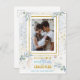 NOTE, você pode ver um sinal de aviso ao escolher este design, que é simplesmente um lembrete para trocar sua própria foto antes de comprar. Deseje aos amigos e à família um Natal mágico com este cartão-postal festivo em cores pastel macio e a sua foto favorita contra um fundo branco coberto de ouro cintilante. Por trás disso, um sutil fundo de blues macios é sobrado com folhas de aquarelas em tons de azul e verde, e salpicos de ouro. Elementos como estocagem de Natal, ornamento e estrelas delicadamente se misturam ao fundo, e a principal tipografia está em um estilo informal peculiar em tons azuis e de ouro. Troque facilmente a sua própria foto, de orientação para retratos, e o seu nome de família na parte inferior. Ao contrário, você pode personalizar facilmente a saudação e seus nomes.