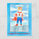 Um cartão postal divertido para desejar a um jovem um feliz aniversário decorado com um super-herói vestido com uma fantasia vermelha, branca e azul com máscara em altura! Ilustrado com aquarela.