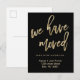 Esses elegantes cartões-postais de mudança de endereço modernos dizem "nós mudamos" em tipografia de ouro falso na moda sobre um fundo preto, e têm espaço de sobra para as informações do seu novo endereço. Você pode usar o modelo para digitar uma mensagem adicional para o verso do cartão-postal, ou deixá-lo em branco.