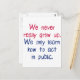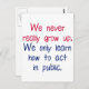 Você pode agir maduro em público, mas isso não significa que você cresceu! Diga a todos que você ainda é jovem com isso: "Nós nunca crescemos realmente. Só aprendemos a agir em público."