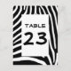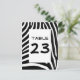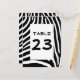 O padrão de listras zebra é preto e branco, com espaço para um número de mesa. Você pode personalizar e apagar a palavra "Mesa" e centralizar o número.