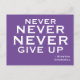 Cartão postal motivacional com as palavras de Winston Churchill. Nunca, nunca, nunca desista. Cartaz roxo com tipografia branca nítida.
