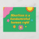 O aborto é um direito humano fundamental, escrito em fonte amarela retrógrada, em uma design de estilo hippie funky para uma feminista pró-escolha. Mostre o seu espírito divertido com este cartão postal bonitinho com flores bonito, ao mesmo tempo que defende os direitos das mulheres e o movimento pró-escolha.