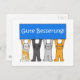 Quatro gatinhos de desenho animado sorrindo e segurando um sinal azul brilhante que diz 'Gute Besserung' que significa 'Get well Logo' em alemão.