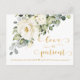 Precisa informar seus convidados de casamento que teve que mudar seu grande encontro? Por favor, use este cartão postal elegante. Design de cartão encantador com flores brancas creme e folhas verdes a cores aquáticas, caligrafia "amor é paciente" a ouro falso moderno, sobre fundo branco. Na parte de trás do buquê de divisor floral branco. Use a ferramenta Personalizar para adicionar suas informações. Para obter itens correspondentes, visite minha Coleção de Celebração de Casamento Adiado.