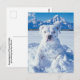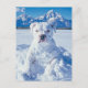 Foto de um cachorrinho fofo coberto de neve, parecendo um cachorrinho. "Saudações Snowy do nosso 'Pitt-snow-bull'! Desejando-lhe um Natal pejorativo e divertido!"