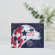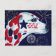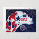 Um cão Dalmático vermelho e azul, patriótico, em um fundo de céu noturno cheio de fogos de artifício. Trabalho de arte por Craig e Tanya Amberson.