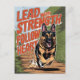 Um cão German shepherd percorre um caminho de floresta com um olhar determinado em seu rosto. Aparece uma mensagem motivacional acima dela, lendo chumbo com força, siga coração.