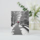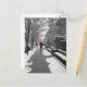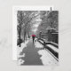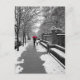 Sob o dossel de um guarda-chuva vermelho, uma mulher anda seu cão em um dia invernal.