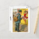 Engraçado, ilustração vintage de um porta-cartas (carteiro) com um saco de cartas para entregar, mas no momento está muito envolvido em um anúncio ocular de uma bailarina de teatro.
