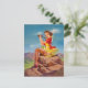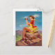 Cartão PinUp Clássico mostrando uma Garota PinUp sentada em uma rocha e explorando a natureza com binóculos, pintado por Art Frahm (1907-1981)