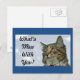 Foto doce do rosto de um gato com a mensagem, "o que é miado com você?", está neste cartão-postal. Este cartão postal fofo é uma forma excelente de manter contato com a família e os amigos.