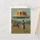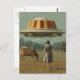 Uma mulher anda num pasto com uma vaca e uma sobremesa de OVNI surreal voa no céu