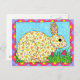 Este coelho suave está coberto por marcações multicoloridas em muitas formas diferentes que lembram as encontradas em talhas pintadas de animais Oaxacanos. Ela está borbulhando em um trevo debaixo de um céu azul sem nuvens. A cena inteira está cercada por uma fronteira detalhada no estilo mexicano.