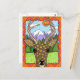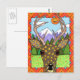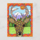 Este belo veado com galhadas muito detalhadas está em primeiro plano, mostrando suas marcações intrincadas e coloridas, semelhantes às encontradas nas esculturas de animais Oaxacanos. Um campo cheio de flores, pinheiros e montanhas criam um fundo intrigante. A cena inteira está cercada por uma borda de estilo mexicano que corresponde às cores da foto.