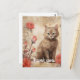 Um gatinho atabuar fofo com olhos azuis impressionantes está sentado ao lado de duas rosas cor-de-rosa contra um fundo com caligrafia vintage e manchas de tinta. Os tons sépia dão um toque quente e antigo à composição, que combina flores e um sujeito animal fofo.