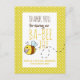 Adicione os detalhes do evento para personalizar este cartões de agradecimentos de chá de fraldas temático BEE (BA-BEE Buzzing) moderno. Super fofo e tenda, com bolinhas amarelas e brancas, abelha bebê bonitinha com tipografia amarela e marrom confortável e atraente. Para obter um partyware correspondente, veja a coleção anexada.