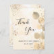 Um cartões de agradecimentos Chá de fraldas. Um fundo de cor aquosa de ouro decorado com ouro eucalipto e pó dourado falso. Na frente, um grande script de cor preta, escrito à mão, e o texto: Obrigado, seu texto, título e uma data. Voltar: Personalize e adicione sua nota de agradecimento e seu nome.