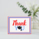 Envie estes cartões postais de cores vermelho, branco e azul para os convidados do seu formando. Escreva uma nota pessoal nas costas. Ele apresenta 'Obrigado' escrito em vermelho e azul com um boné formando.
