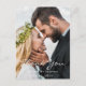 Na frente: adicione sua própria foto de casamento, retrato/tamanho vertical. Com o texto: Obrigado por escrever com um grande estilo moderno e manuscrito. Modelos para seus nomes e data de casamento. Texto branco. Verso: gradiente azul empoeirado como fundo. Modelo pela sua nota de agradecimento. Texto preto. Perfeito para um casamento de inverno ou praia!