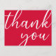 Um fundo vibrante vermelho cereja. Na parte da frente, grande letra manuscrita com o texto: Obrigado. Costas: Modelo para o seu bilhete e nome/nomes de agradecimento. Dica: Se você não quiser que pareça um cartão postal, clique em personalizar, vá para trás e remova o divisor e o selo postal.