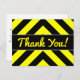 Este design de cartão postal apresenta um padrão preto e amarelo em forma de chevron. Ele também apresenta a mensagem "Obrigado!" na frente em texto amarelo com estilo de escrita manual, juntamente com uma mensagem personalizada de agradecimento no verso.