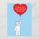 Um gato branco fofo segurando um grande balão em forma de coração vermelho que diz "Obrigado por cuidar de mim". A imagem tem um fundo azul pálido.