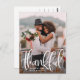 O obrigado de casamento moderno elegante que você postcard apresenta sua foto favorita de casamento vertical ou orientada a retratos, com "agradecimento" sobreposto em letras brancas manuscritas. Personalize com seus nomes e adicione um obrigado pré-impresso personalizado que você envia e assina no verso, com uma foto adicional. Espaço fornecido para seu endereço de retorno e endereçamento de destinatário.