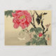 Ave empoleirada em um galho, observando uma borboleta, com grande flor no arbusto. Impressão vintage da coleção da Biblioteca do Congresso (impressões e desenhos japoneses). Excelente exemplo de arte japonesa tradicional antiga. Adicione um sabor oriental.