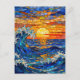 A postcard with an illustration of a stained glass mosaic ocean waves and sunset illustration.