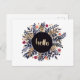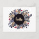 A ilustração é feita com aquarelas e guaches no papel. Indigo, ostro e folhagem laranja e flores com uma mão escrita como olá de ouro no meio.
