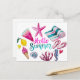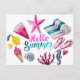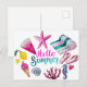 Olá Verão com peixes-estrela, toalha de praia, cavalo marinho, chinelos, sorvete, limão, erva-do-mar, melancia e concha em fundo branco.