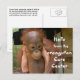 Este cartão-postal orangotango apresenta um orangotango bebê logo após ter sido salva, alimentada e banhada por cuidadores no Centro de Cuidados da Fundação Orangutan, na ilha de Borneo (Kalimantan, Indonésia). Os ovangotangos são uma espécie ameaçada, que se encontra na natureza apenas na floresta tropical de duas ilhas - Borneo e (em menor grau) Sumatra. Em qualquer momento, há entre 300 e 400 órfãos sendo criados nesta instalação. Rebecca Reeder é voluntária e doa 100% de seus lucros para ajudar a salvar da extinção esses macacos excelentes gentis. Embora os orangotangos sejam muitas vezes chamados macacos, eles são uma espécie diferente - macacos excelentes. Entre os macacos, os orangotangos são conhecidos pela sua disposição suave. São animais inteligentes com impressões de dedos e 3 dos mesmos tipos sanguíneos que os humanos.