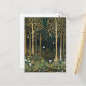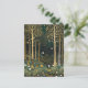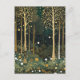 Uma cena florestal fantástica e encantadora com uma paleta verde e dourada. Árvores altas e estilizadas com troncos e galhos ouros chegam em direção a um céu escuro, seus membros adornados com frutas esféricas ou brilhantes. O primeiro plano é uma tapeçaria densa de folhagem detalhada, recheada de flores estilizadas e plantas em tons de verde, creme e ouro em xisto. As órbitas luminosas flutuam pelo ar e descansam no chão, criando uma atmosfera mágica que lembra uma floresta sonhadora. A composição global é altamente decorativa, com uma perspectiva plana e padrões complexos que enchem a canvas.