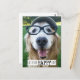 É um dia feliz! Este cartão-postal mostra uma fotografia de um sorridente cão que está a vestir um chapéu e óculos. Texto na frente lê, "Get Your Happy On!" enquanto texto personalizável nos estados traseiros, "Tenham um excelente dia!"