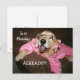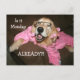 Este cartão-postal engraçado mostra uma fotografia de um cão que recupera ouros fofo em óculos, robe rosa e rolamentos, juntamente com a frase, "Já é segunda-feira?!"