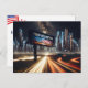 Um cartaz proeminente com a bandeira americana e a mensagem "Votem assuntos" se destacam contra o fundo de arranha-céus iluminados com trilhas de semáforo. Todo o texto pode ser mudado.