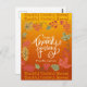 Folhas coloridas com tipografia branca em laranja cinza queimada, terracota, fundo amarelo e nome da família para personalizar. Perfeito para uma saudação maravilhosa para familiares e amigos durante as férias de Ação de Graças.