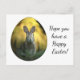 Uma bela fotografia de um coelho num ovo com a mensagem "Espero que tenha uma Felz pascoa!", figura neste cartão postal de férias. Uma maneira fofa de enviar saudações Páscoas para a família e amigos!